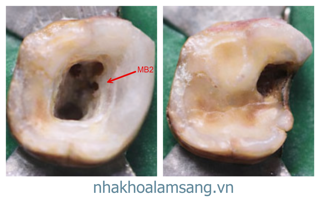- Rào cản canxi: MB2 thường bị che khuất bởi một gờ ngà. Nếu chỉ dùng thám trâm dò dẫm sẽ rất khó thấy. Anh em nên dùng mũi siêu âm hoặc mũi tròn nhỏ mài nhẹ dọc theo rãnh nối này để bộc lộ miệng ống.